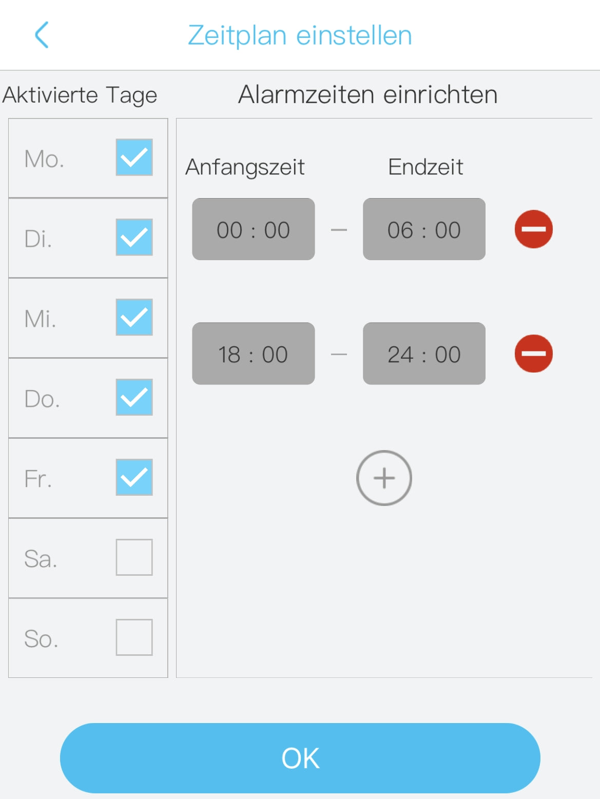 Sie können in der APP einen Zeitplan für die Bewegungserkennungsfunktion festlegen. Dadurch versucht die Kamera nur für einen bestimmten Zeitraum, Bewegungen zu erkennen und aufzuzeichnen.